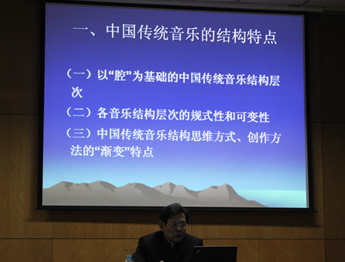 王教授以其新作《中国传统音乐结构学》为基础,集中于“中国传统音乐的结构特点”和“哲学基础”两方面展开讲座。王教授在“中国传统音乐的结构特点”的论述中,提出了“以‘腔’为基础的中国传统音乐结构层次”、“各音乐结构层次的规式性和可变性”、“中国传统音乐结构思维方式、创作方法的‘渐变’特点”。王教授的阐述简明扼要、条分缕析、层层展开,在“以腔为主的中国传统音乐结构中”,列举“腔音”、“腔音列”、“腔节”、“腔韻”、“腔句”、“腔段”、“腔调”、“腔系”等结构特点,每一部分都例举并演唱包括京剧、越剧、吕剧、南音和各地民歌,王教授强调“腔”结构的演唱,风格凸显,演唱生动,入木三分。特别是以《孟姜女》在全国各地甚至在少数民族民歌中变异的例子,为在场师生留下非常深刻的印象。
