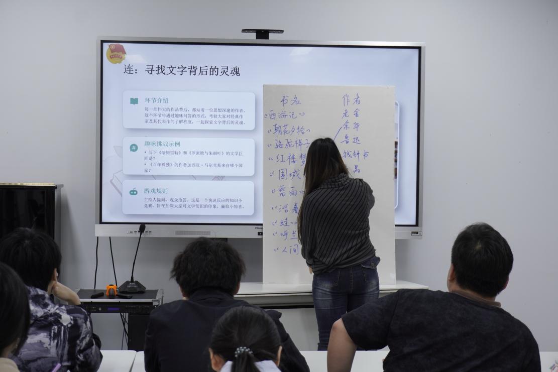 本次活动以“享、连、猜、留”四大趣味板块为载体,为同学们带来沉浸式阅读互动体验。在“享——好书安利会”环节,同学们依次登台分享喜爱的书籍,内容涵盖经典名著、散文随笔、青春文学与科幻作品等,大家用简洁真挚的语言分享阅读感悟,传递文字带来的温暖与力量,现场掌声不断;“连——书名作者连连看”环节,同学们在紧张而愉悦的氛围中默契配合、相互提醒,在轻松竞技中加深对经典著作的认识与记忆;“猜——emoji猜书名”环节创意十足,生动的表情符号谜题一经展示,大家便积极举手抢答,现场气氛热烈、欢声笑语不断,在趣味互动中感受阅读的独特魅力;“留——书言留声机”环节,同学们认真写下书中触动心灵的经典语句,粘贴至留言展板,一行行文字凝聚阅读力量,留存下温暖而美好的阅读瞬间。