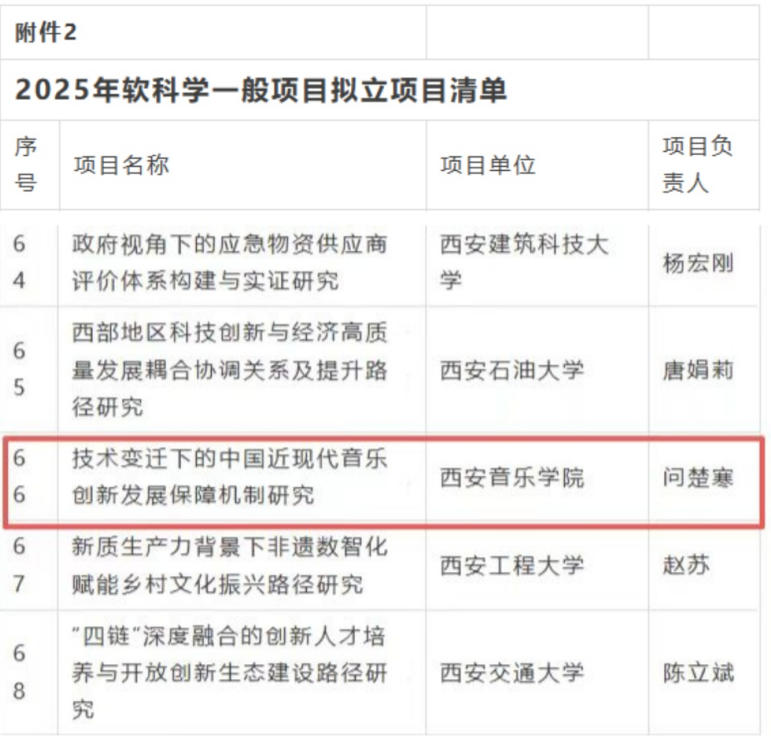 问楚寒《技术变迁下的中国近现代音乐创新发展保障机制研究》获批西安市2025年软科学研究项目。