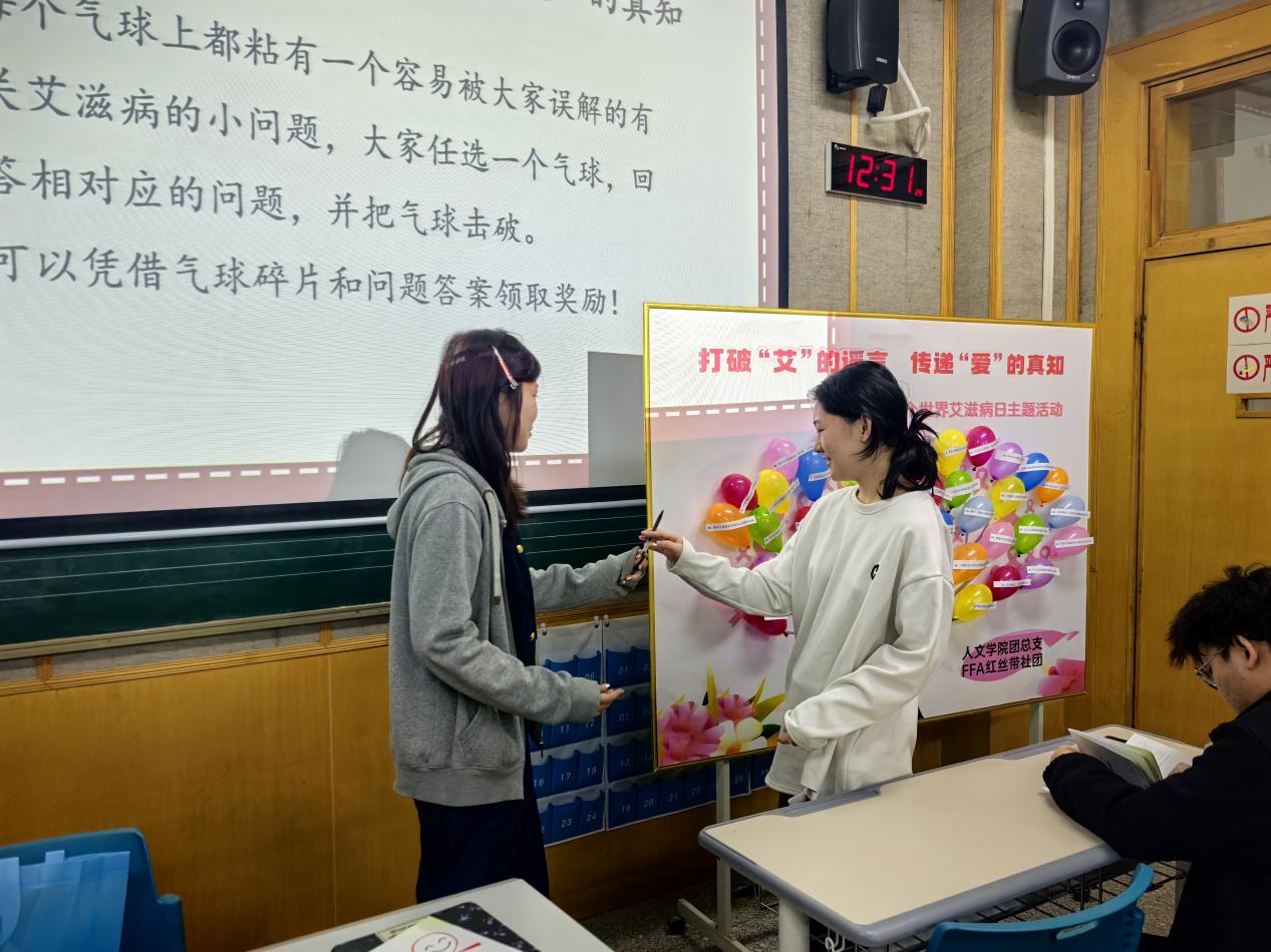 为进一步加强校园艾滋病防治宣传教育工作,提升学生艾滋病防治意识,12月1日中午,在雁塔区疾控中心、校卫生所指导下,人文学院团总支、FFA红丝带社团组织开展“社会共治 守正创新 终结艾滋”艾滋病主题宣传活动。活动以专业科普与游戏互动相结合的形式,为同学们带来了一场实用且深刻的健康知识盛宴。