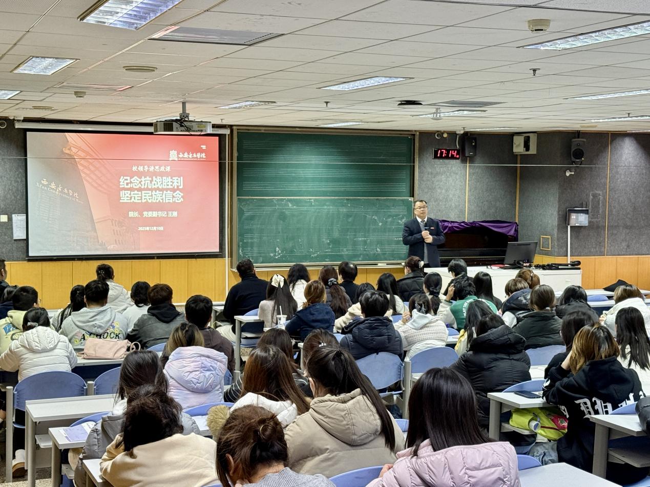12月10日下午,西安音乐学院院长、党委副书记王刚以《纪念抗战胜利坚定民族信念》为题,为人文学院师生讲授...